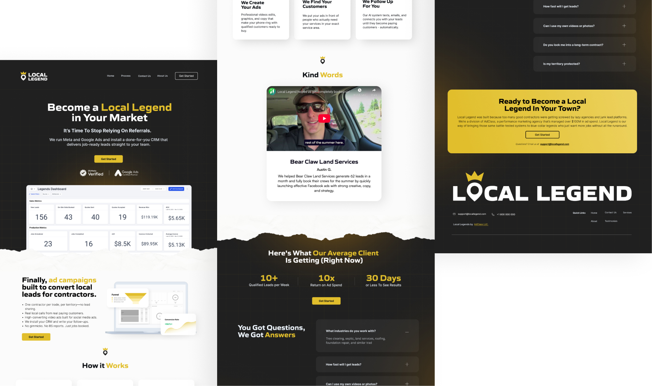 Local Legend needed a website that speaks clearly to local business owners while supporting a CRM SaaS platform. The work focused on building an organic and grounded visual system that feels familiar to service based businesses, while keeping the product and offer easy to understand. Structure and copy were shaped to explain both the ads service and the software in one smooth flow. The site now communicates trust, practicality, and a clear path to growth.